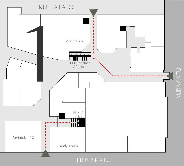 Sisäänkäyntimme on Hansakorttelin 2. kerroksessa, ovi Lindexiä vastapäätä.